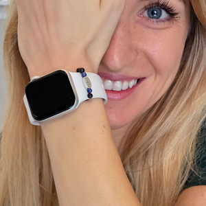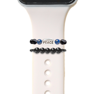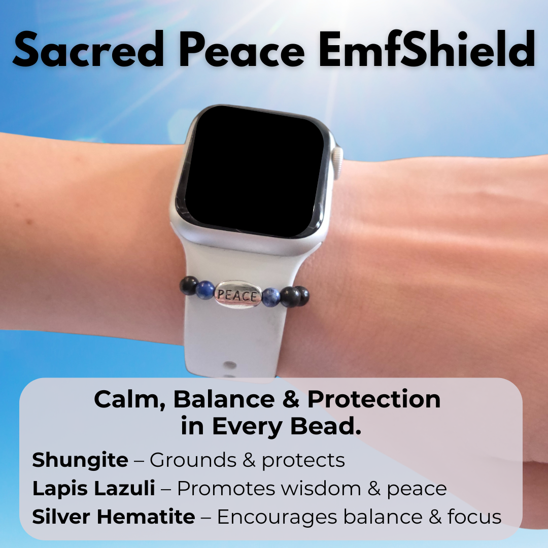 Both handcrafted slider bands are designed to fit securely over most smartwatch straps, giving you stylish EMF protection without compromising comfort. The Sacred Peace EmfShield blends authentic Shungite with Lapis Lazuli, Hematite, and a silver Peace charm—perfect for days you want to carry serenity and truth. The All-Shungite EmfShield, featuring five polished Shungite stones with grounding Hematite beads on the reverse side, delivers a minimalist yet powerful shield of energetic protection.